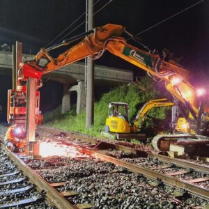 Mit unserer Vibroramme vom Typ Movax können sowohl Stahlträger als auch Spund Bohlen in den Boden getrieben werden. Da es sich hierbei um eine Ramme mit Hochfrequenz handelt, werden die Vibrationen in der unmittelbaren Umgebung auf ein Minimum beschränkt. Da es sich dabei um ein Anbaugerät handelt, kann es im Gegensatz zu einer Konventionellen Ramme rasch und flexibel eingesetzt werden.